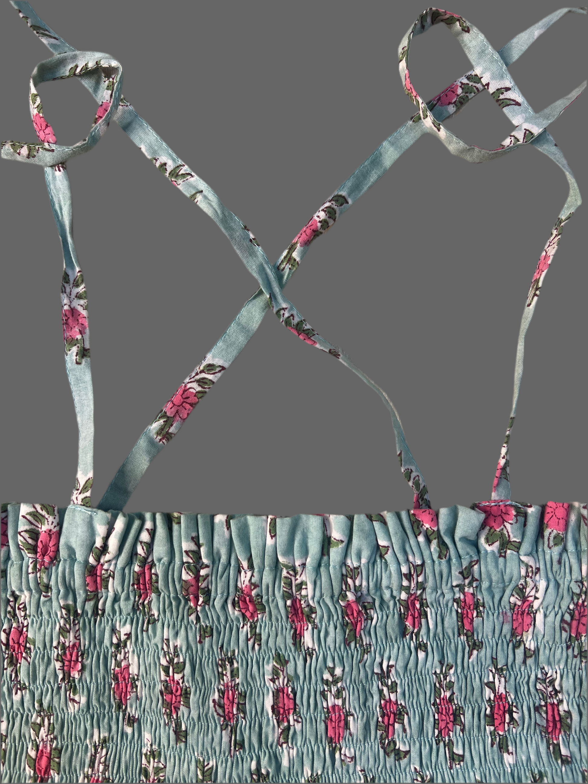 Posy is an easy wear summer dress with shirred bodice and tie shoulder straps. Crossed over at the back keeps straps on shoulders. When they have grown enough it can then be worn as a skirt (tie the ties on shoulder or cut them off)