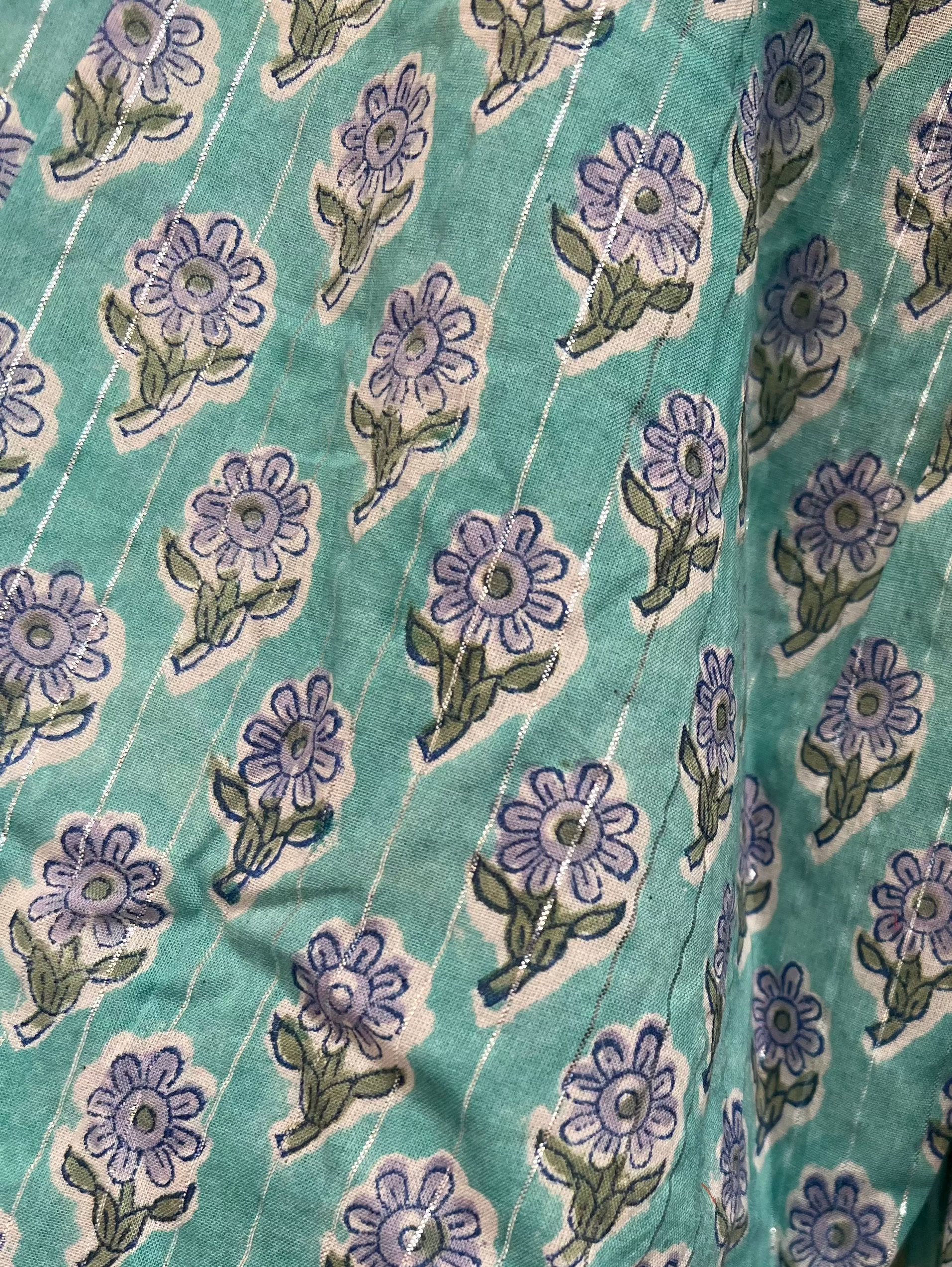 A free-size mid length dress crafted from soft hand block printed cotton, with a subtle lurex thread woven through for a gentle shimmer. The fabric features an all-over floral block print, giving it a handcrafted, artisanal feel.