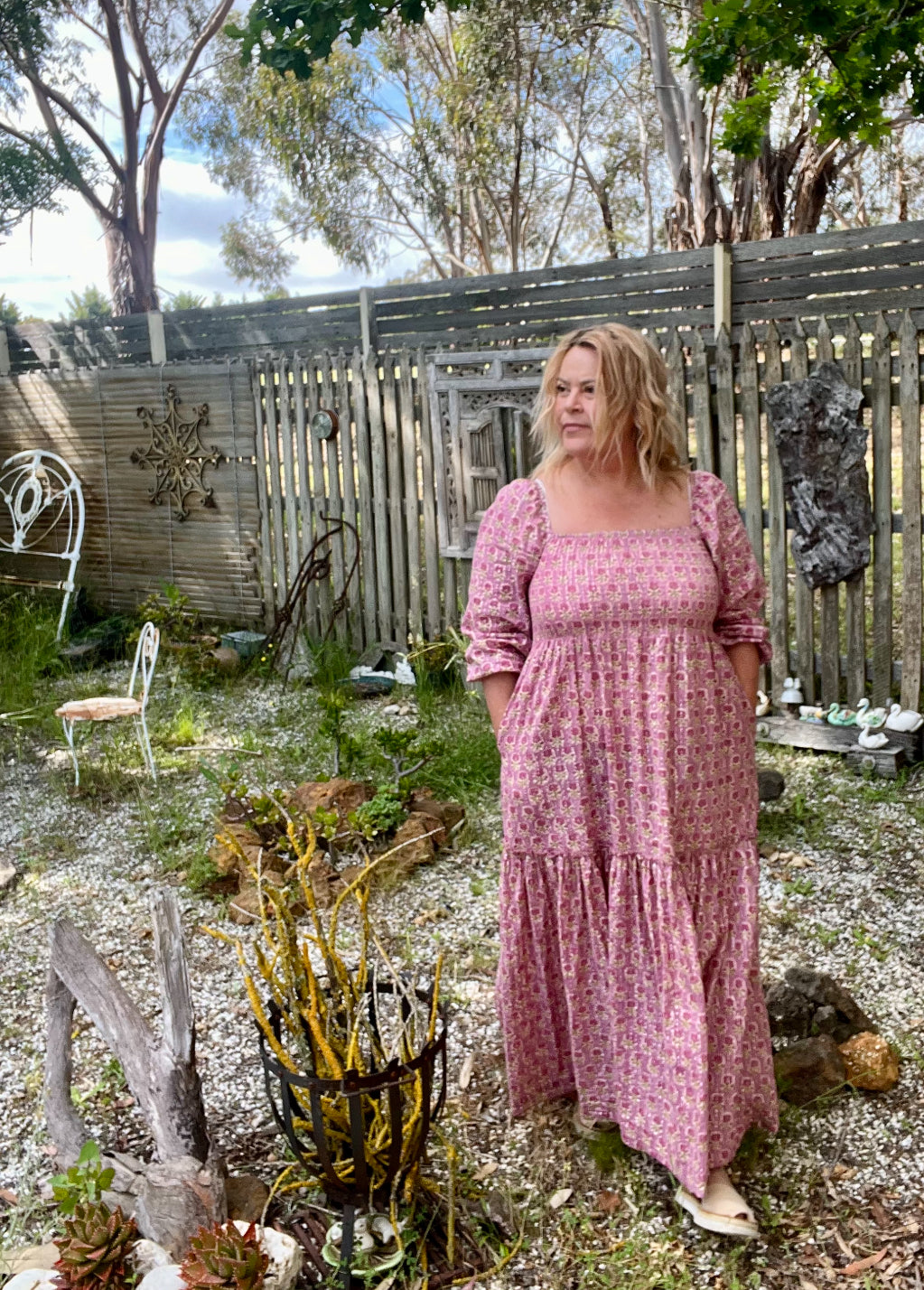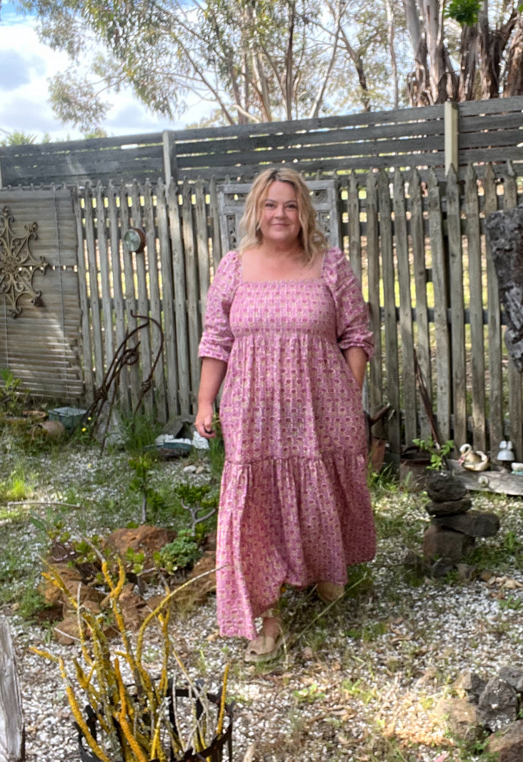 A free-size maxi dress crafted from soft hand block printed cotton, with a subtle lurex thread woven through for a gentle shimmer. The fabric features an all-over floral block print, giving it a handcrafted, artisanal feel.